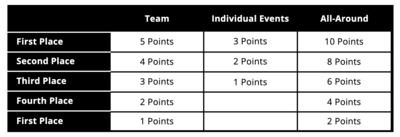 All Other Levels: 1st-3rd on each event and all-around.